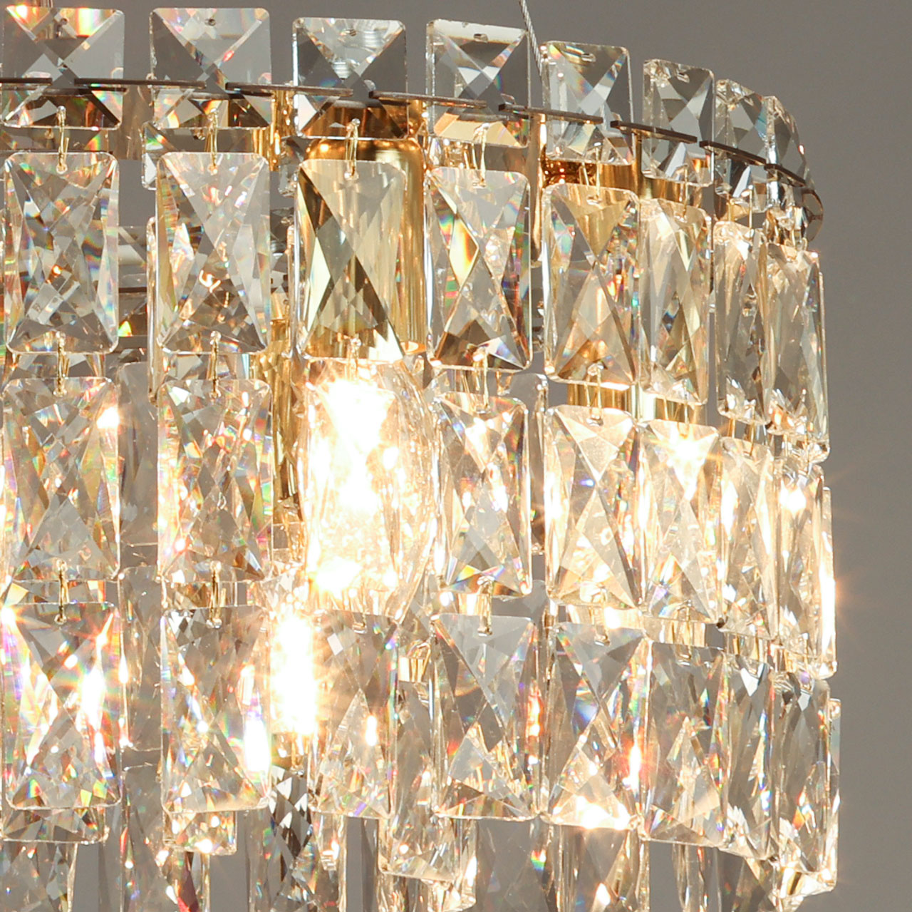 Металлическое основание люстры гальванизировано в цвет золота. Светильник декорирован прозрачным хрусталем прямоугольной и квадратной формы.