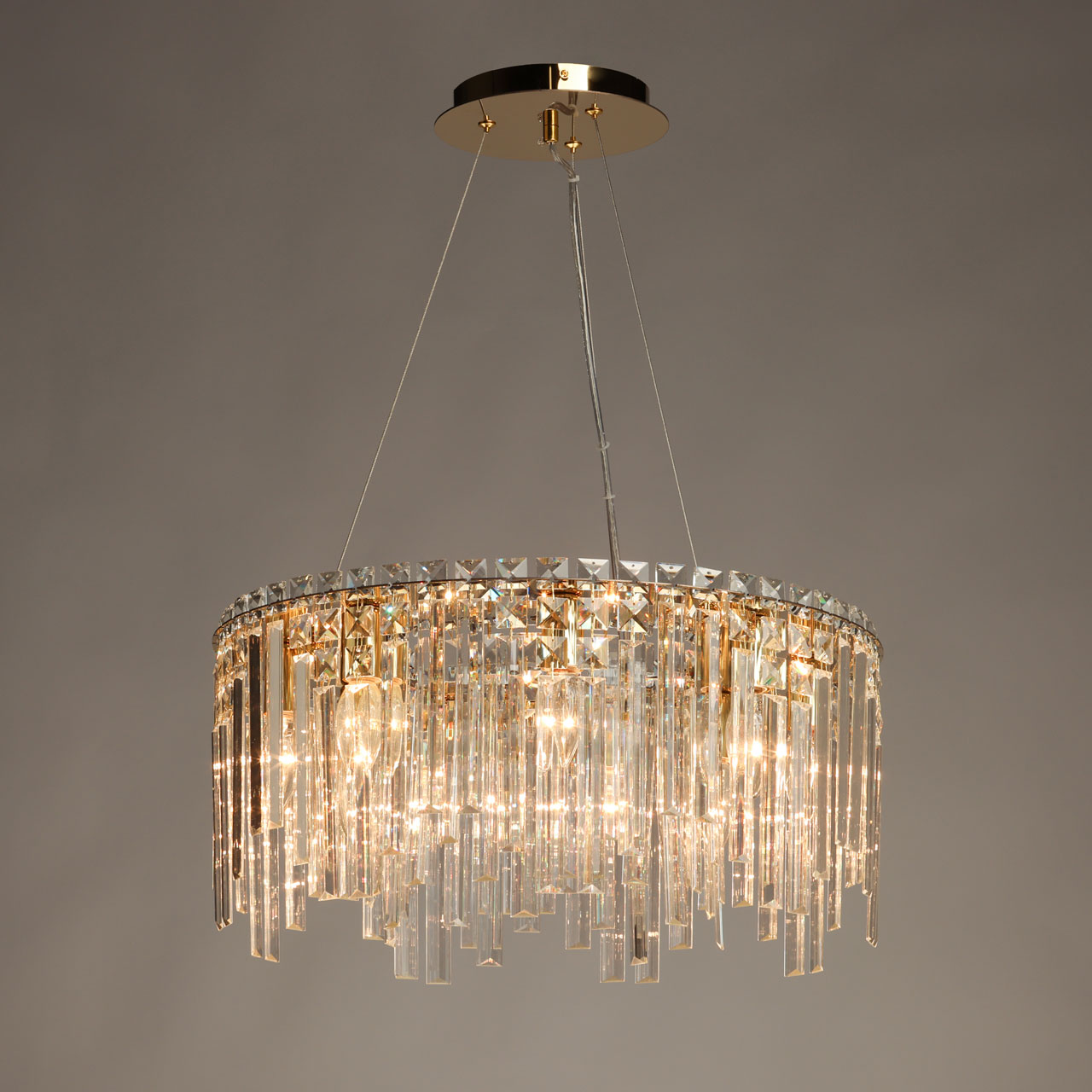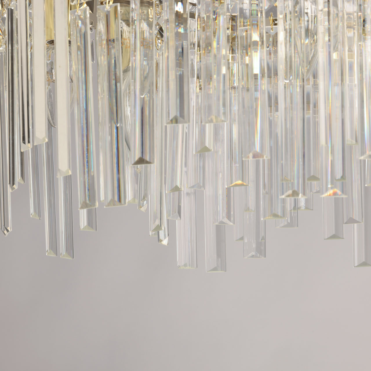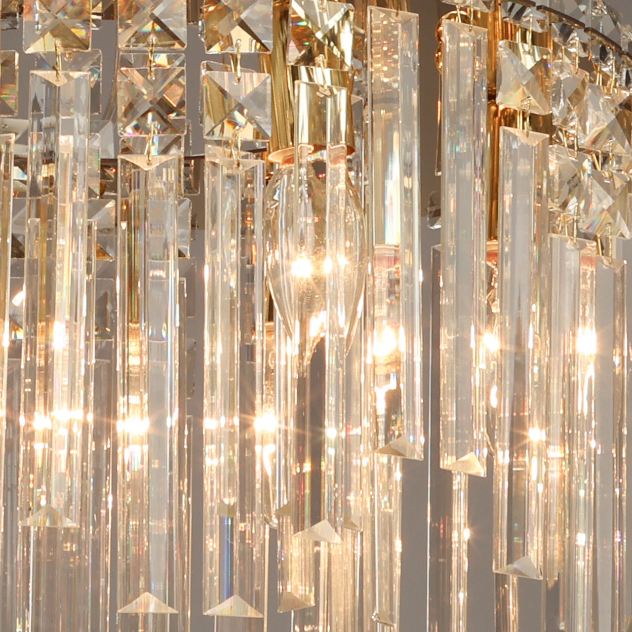 Металлическое основание люстры гальванизировано в цвет золота. Светильник декорирован прозрачным хрусталем вытянутой и квадратной формы.