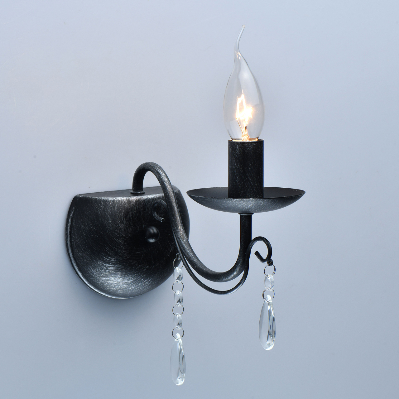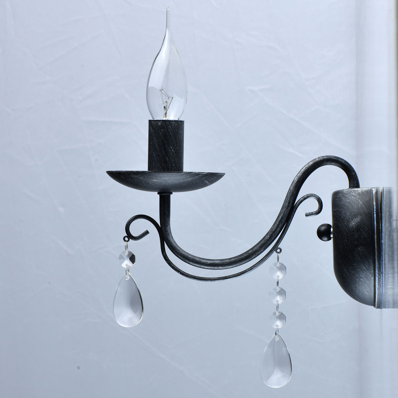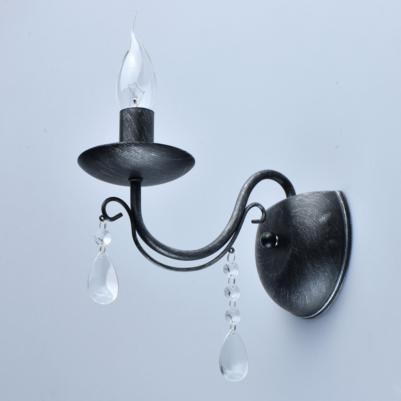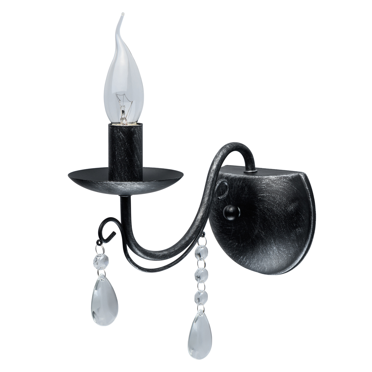 Классическая форма рожка-свечи с основанием черного цвета с серебристой патиной.Декор из хрустального стекла. Открытый источник света обеспечивает комфортное зональное освещение.Бра дополняет семью светильников на 5 и 8 рожков.