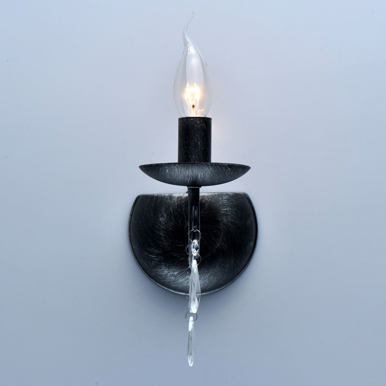 Основание светильника выполнено из металла и обработано по технологии хай-лайт, где основной слой черного цвета, а декоративный слой серебряного цвета. Светильник декорирован прозрачным хрусталем.