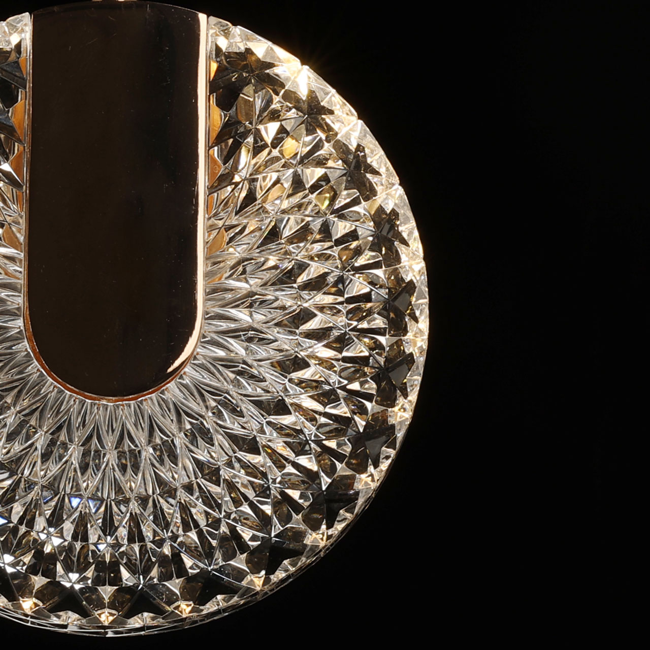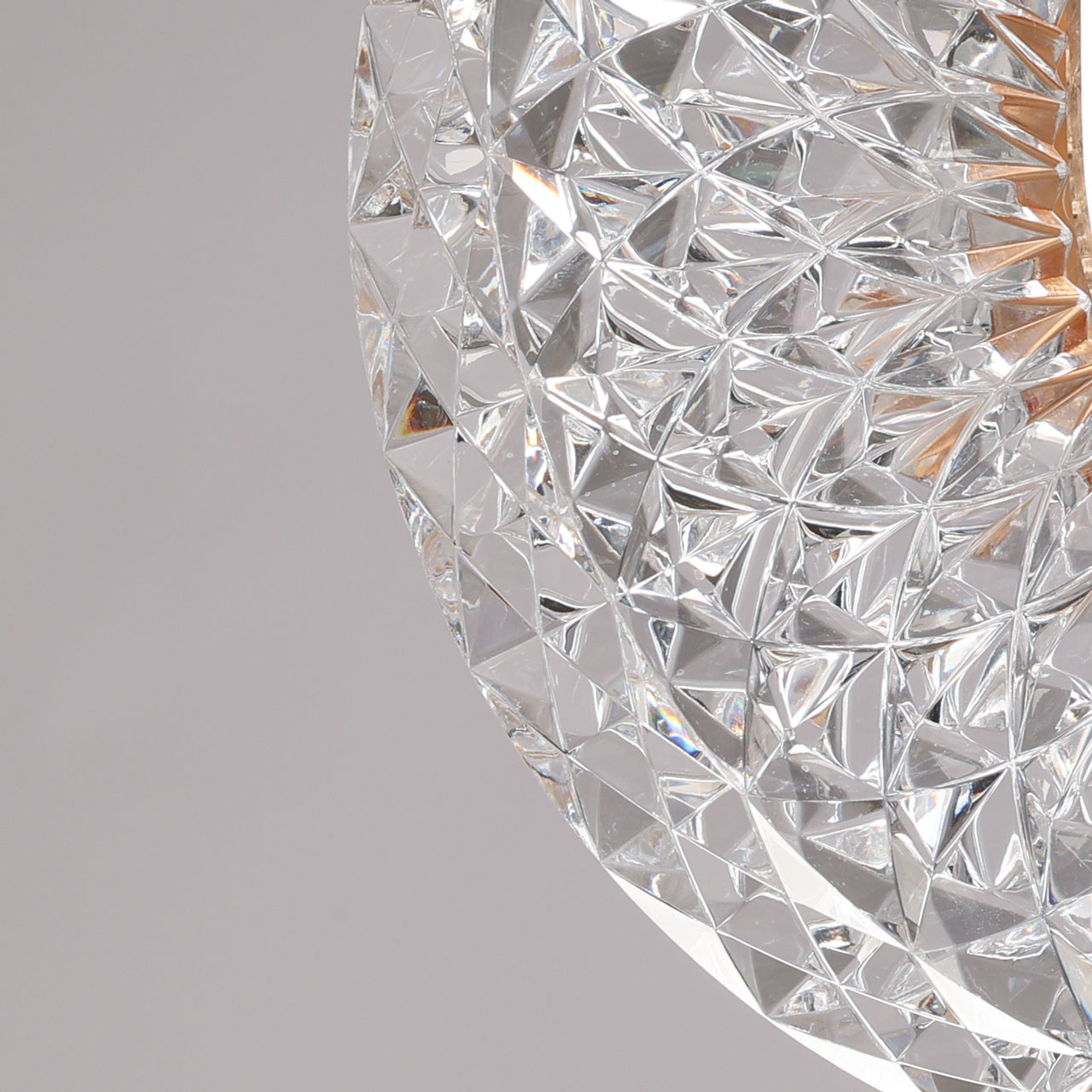 Металлическая потолочная чаша подвеса гальванизирована в цвет французского золота. Корпус плафона в виде пластины выполнен из сплава алюминия с цинком и гальванизирован в цвет основания. Светодиодный источник света закрыт прозрачным фактурным акрилом.