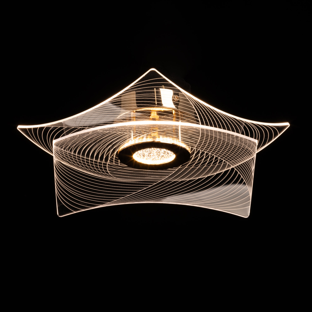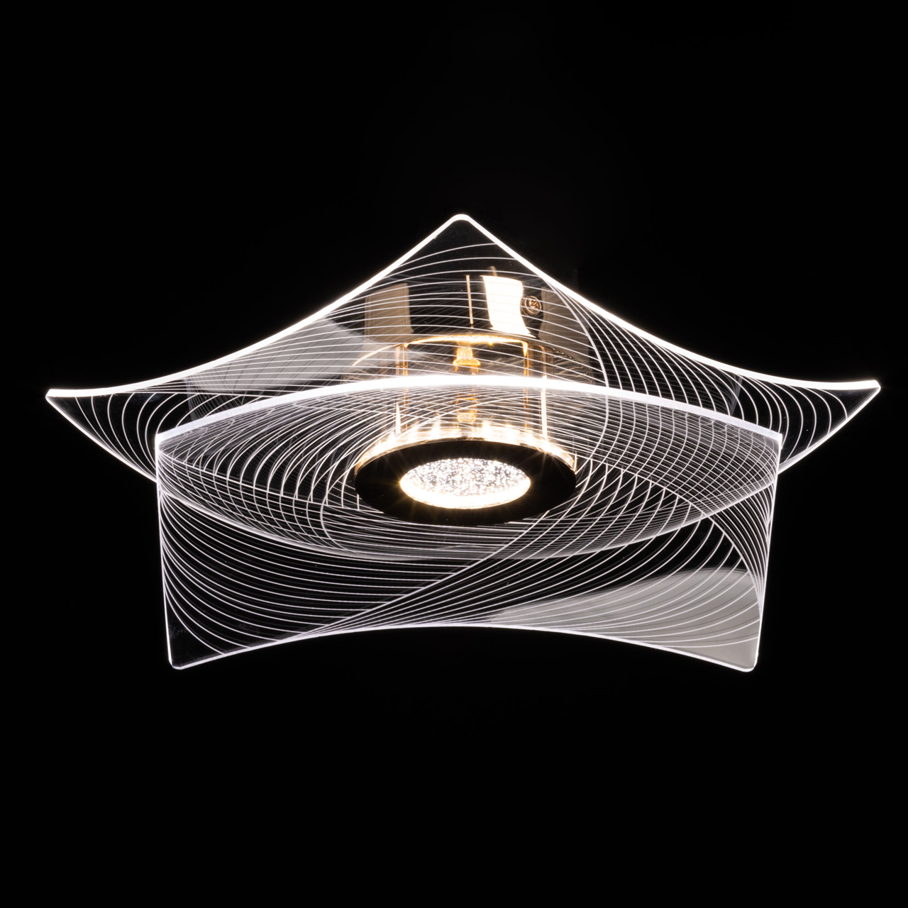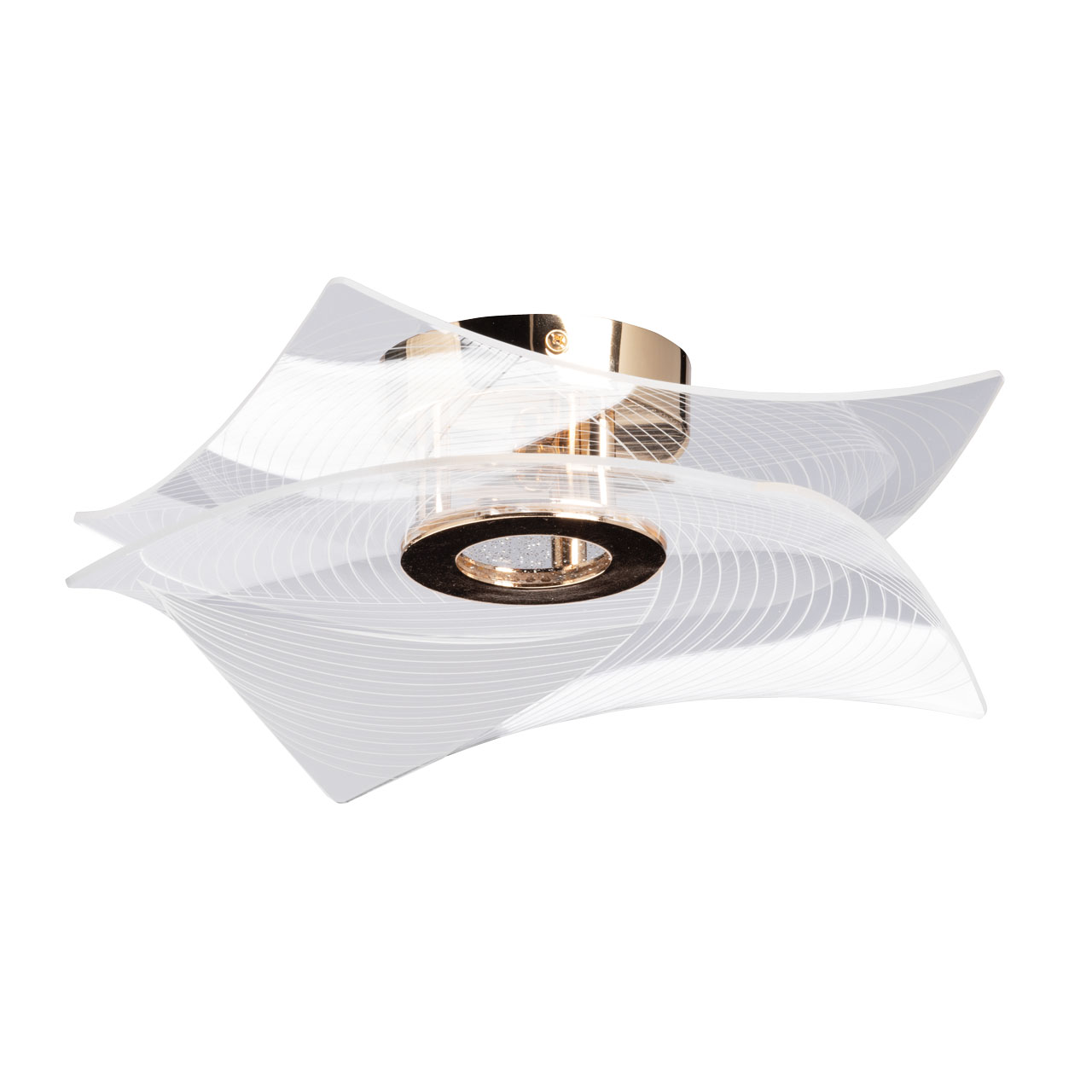 Металлическое основание потолочной люстры гальванизировано в цвет золота. Люстра декорирована прозрачным акрилом оригинальной формы с линейным рисунком.