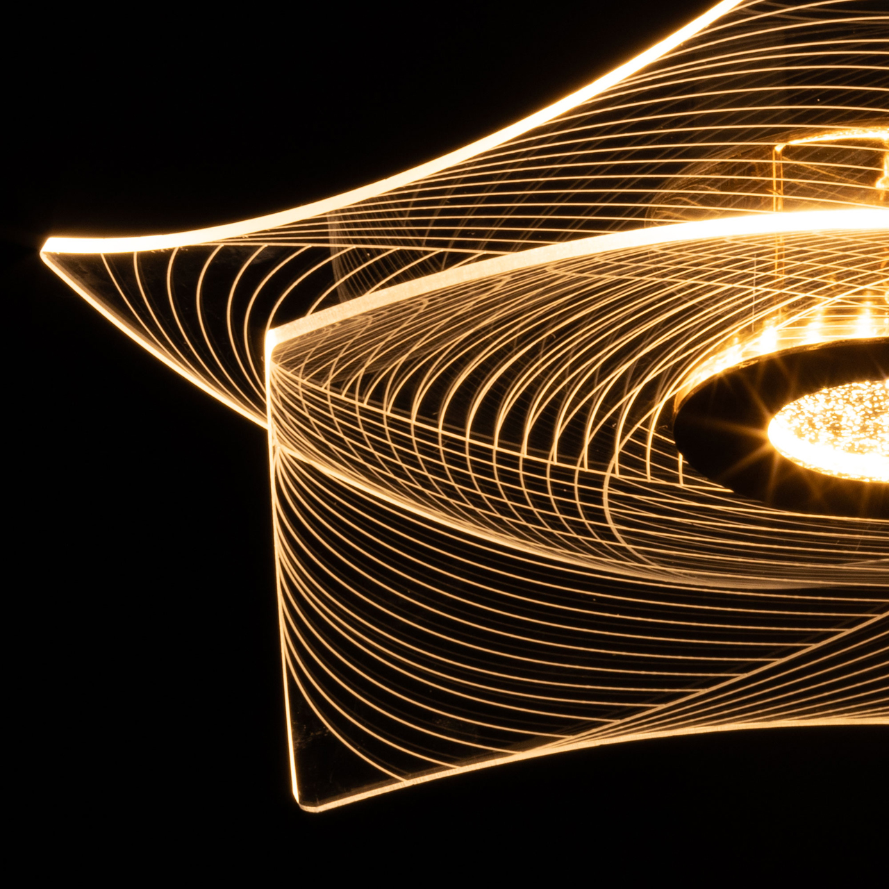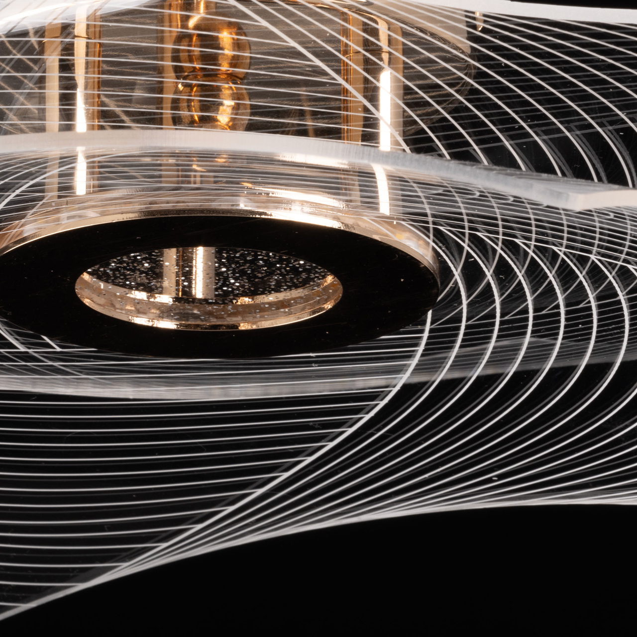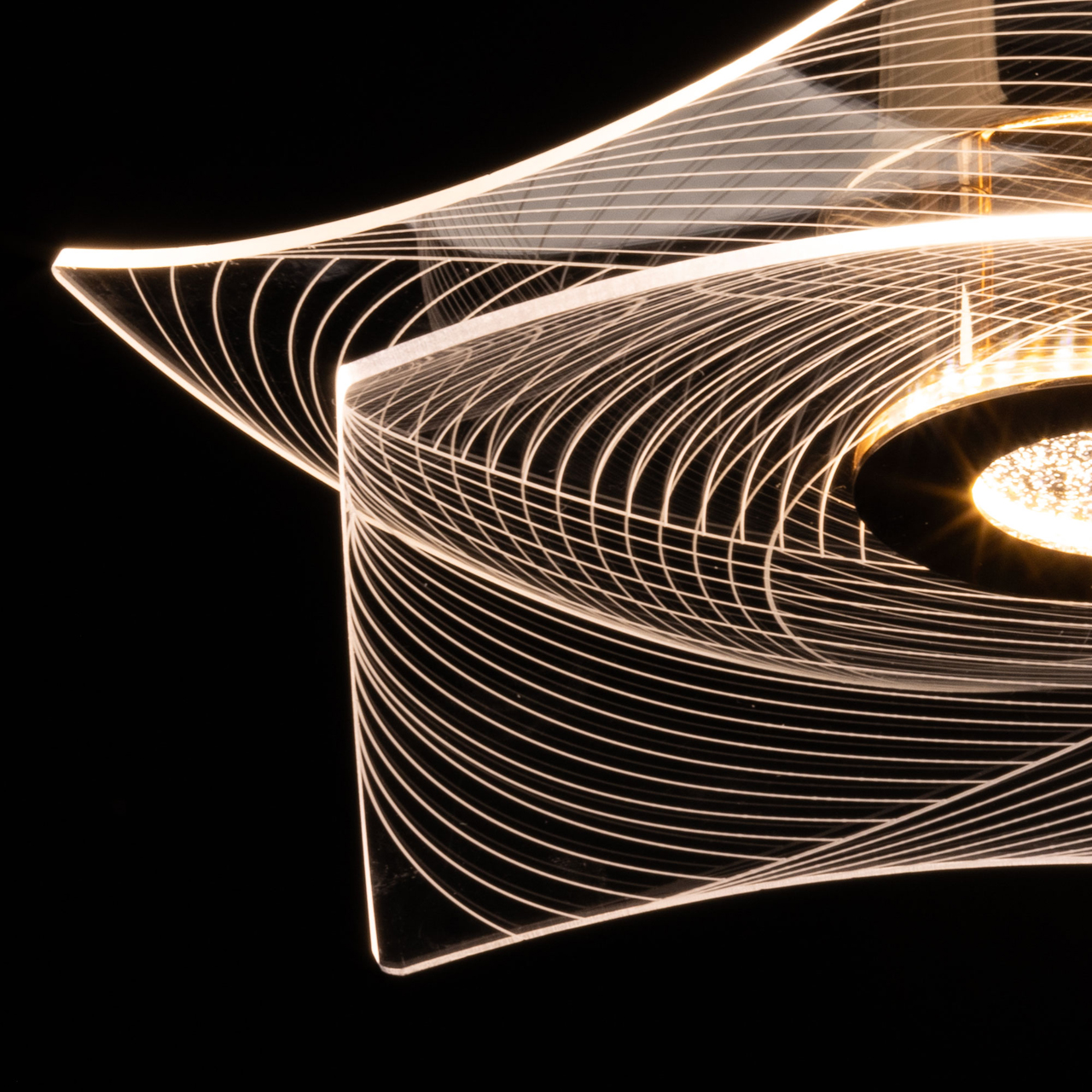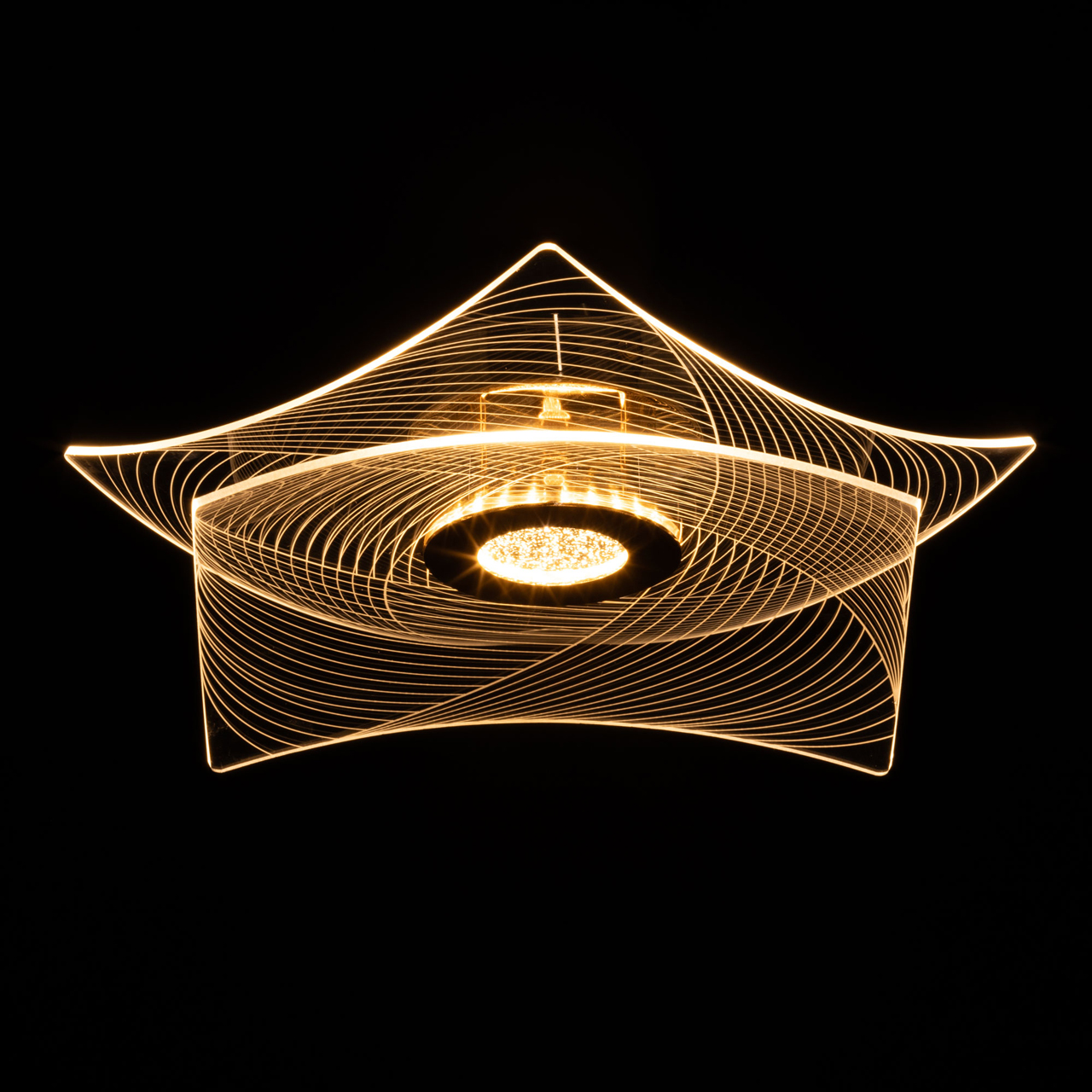 Металлическое основание потолочной люстры гальванизировано в цвет золота. Люстра декорирована прозрачным акрилом оригинальной формы с линейным рисунком.