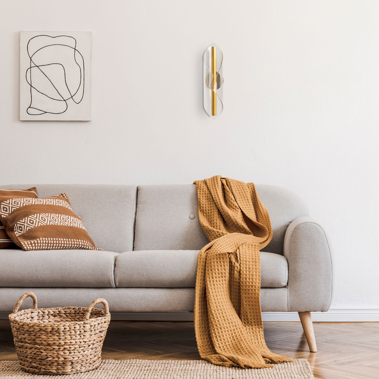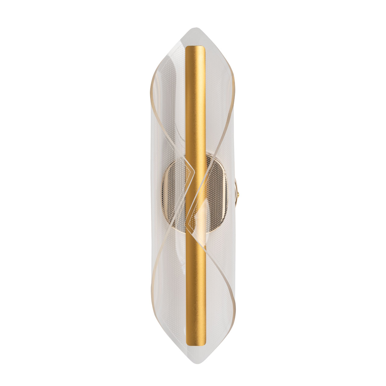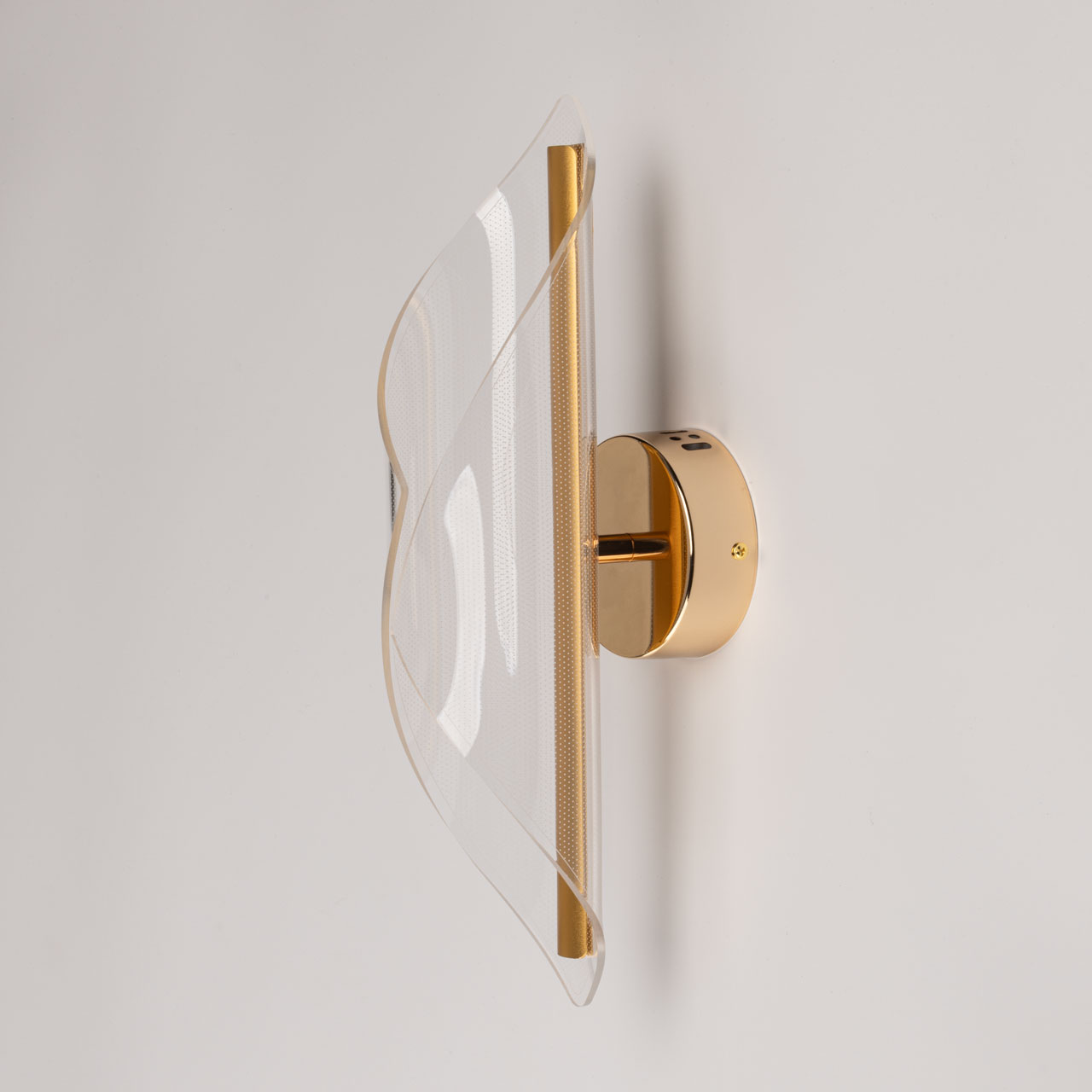 Металлическое основание настенного бра гальванизировано в цвет золота. Основа плафона выполнена из сплава алюминия с цинком и гальванизирована в цвет основания. Настенное бра декорировано прозрачным акриловым плафоном с точечным рисунком.