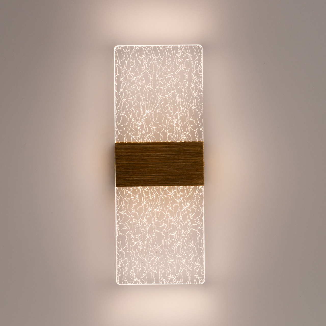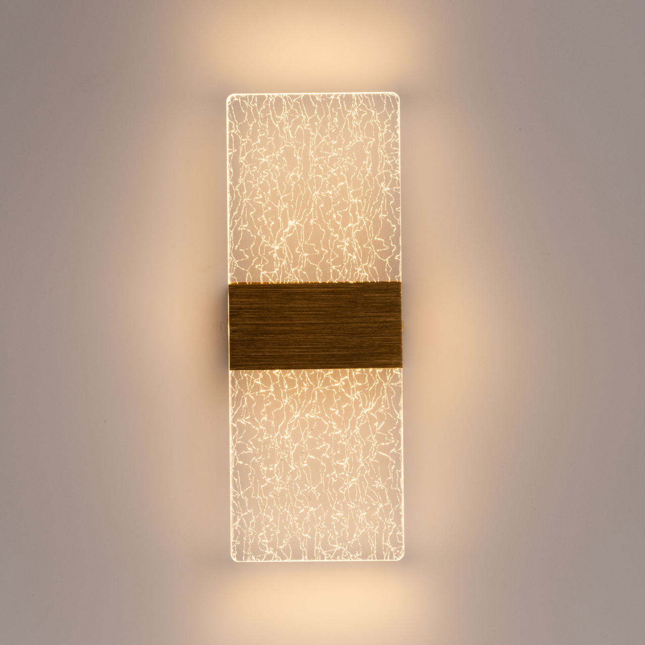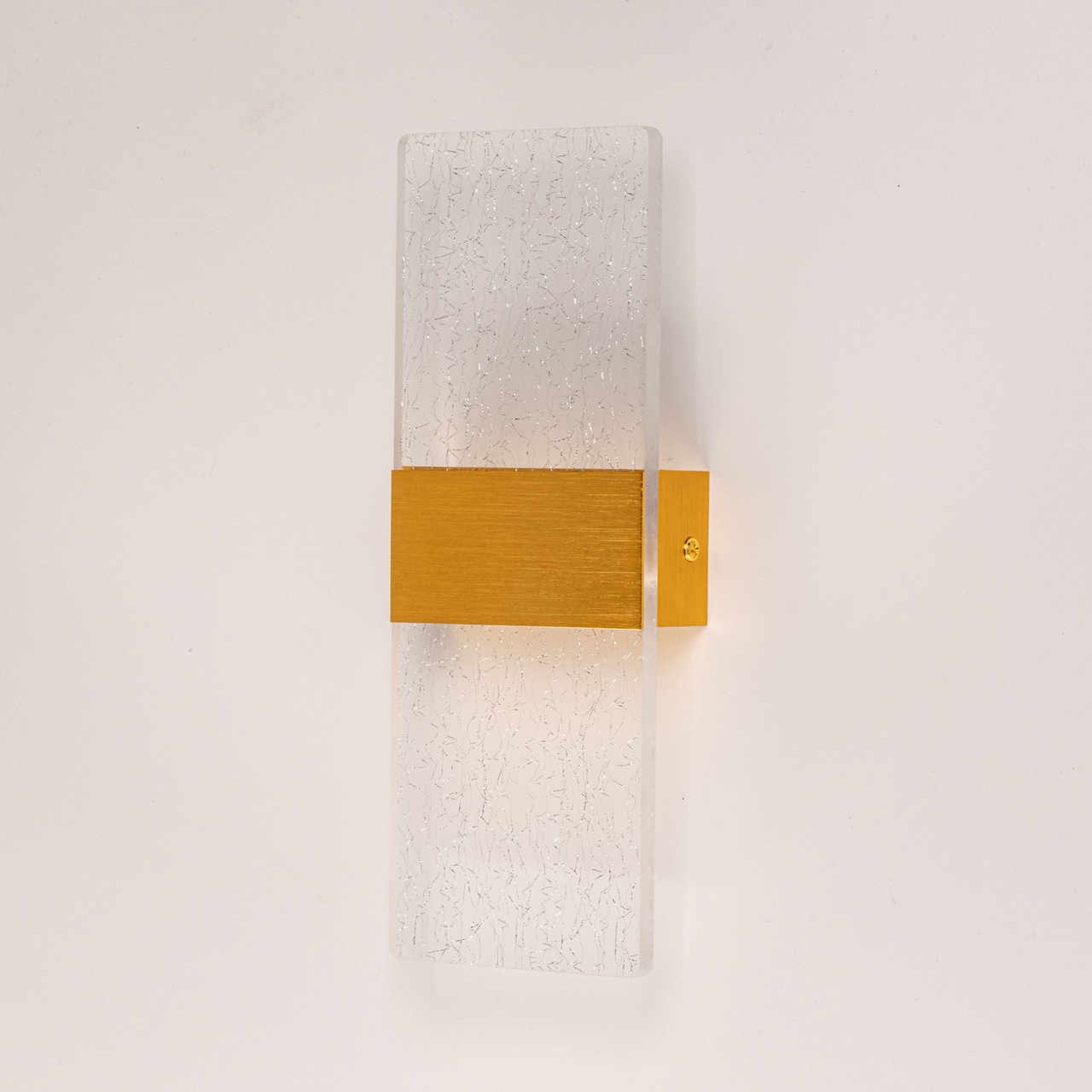 Металлическое основание настенного бра окрашено в цвет золота. Корпус плафона выполнен из сплава алюминия с цинком, обработан по технологии брашинг и оксидирован. Настенное бра декорировано полупрозрачным акриловым плафоном с вкраплениями нитей золотого цвета.