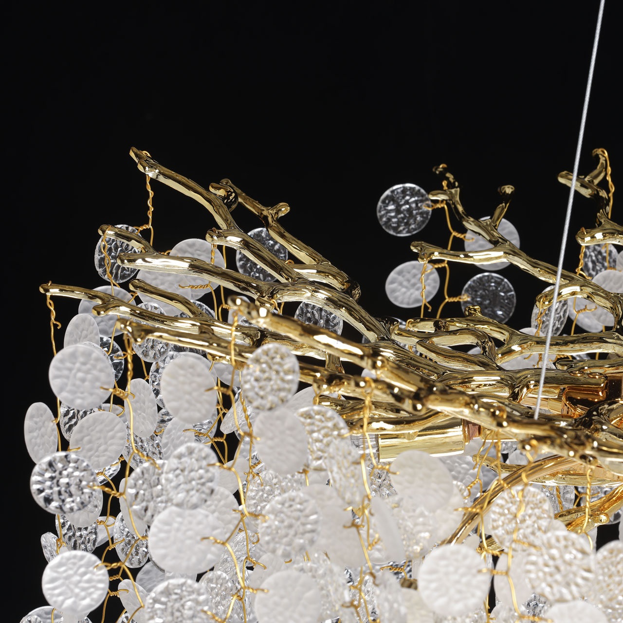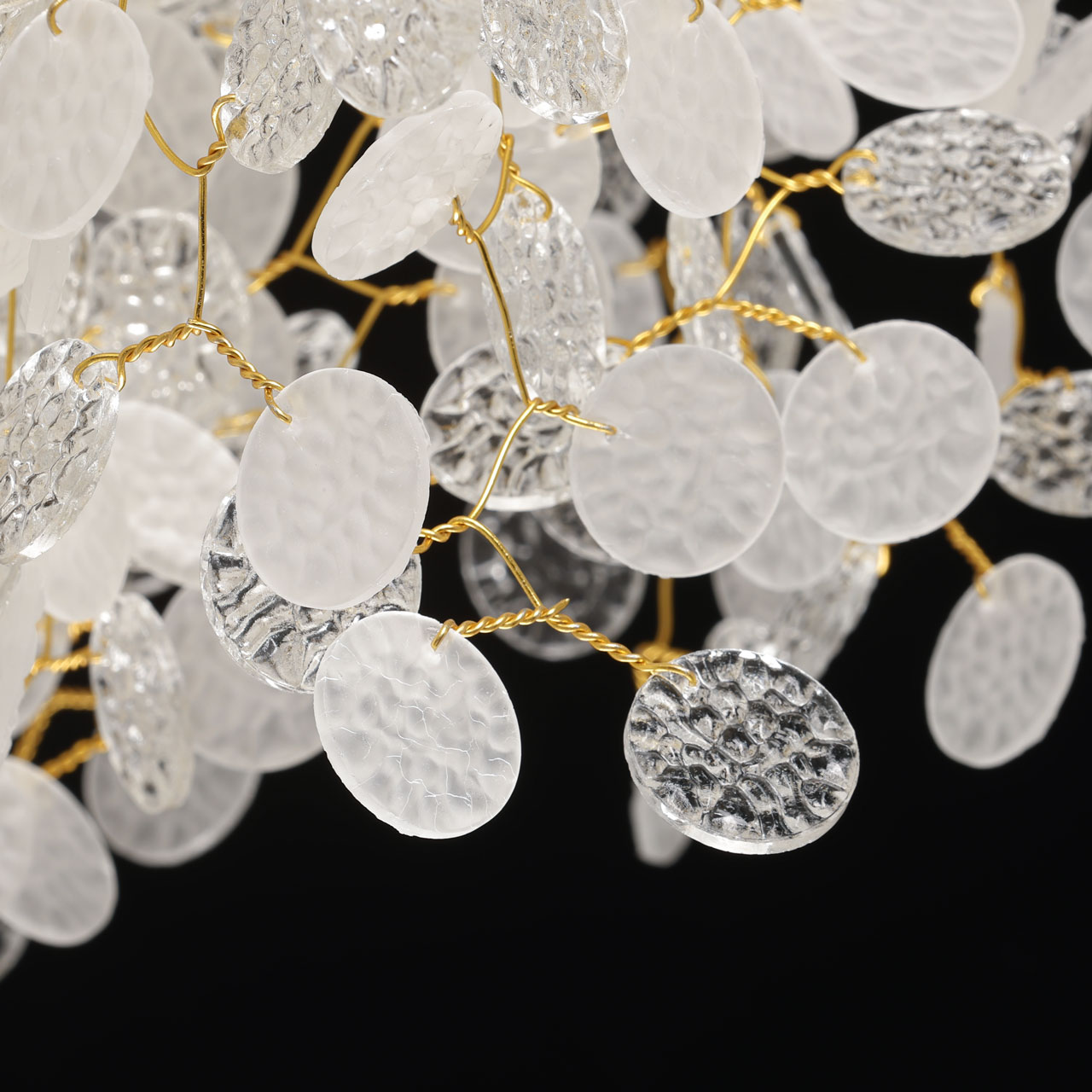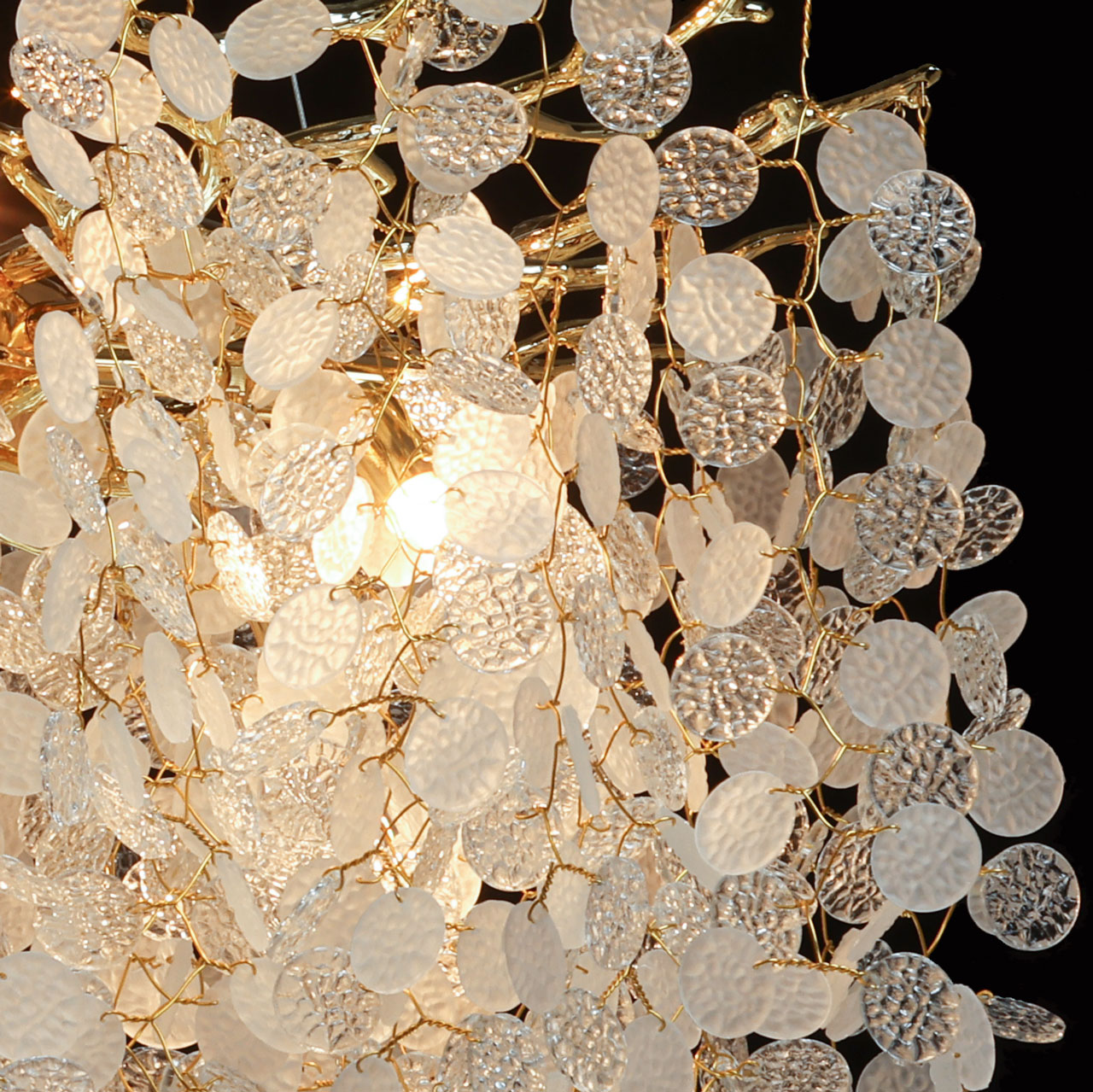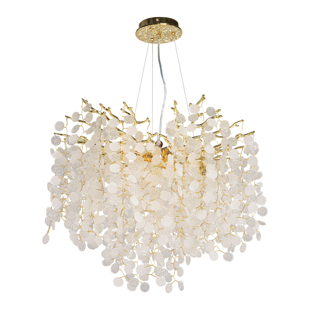 Основание подвесной люстры выполнено по технологии художественного литья из сплава алюминия с цинком и гальванизировано в цвет золота. Люстра декорирована прозрачным фактурным стеклом круглой формы.