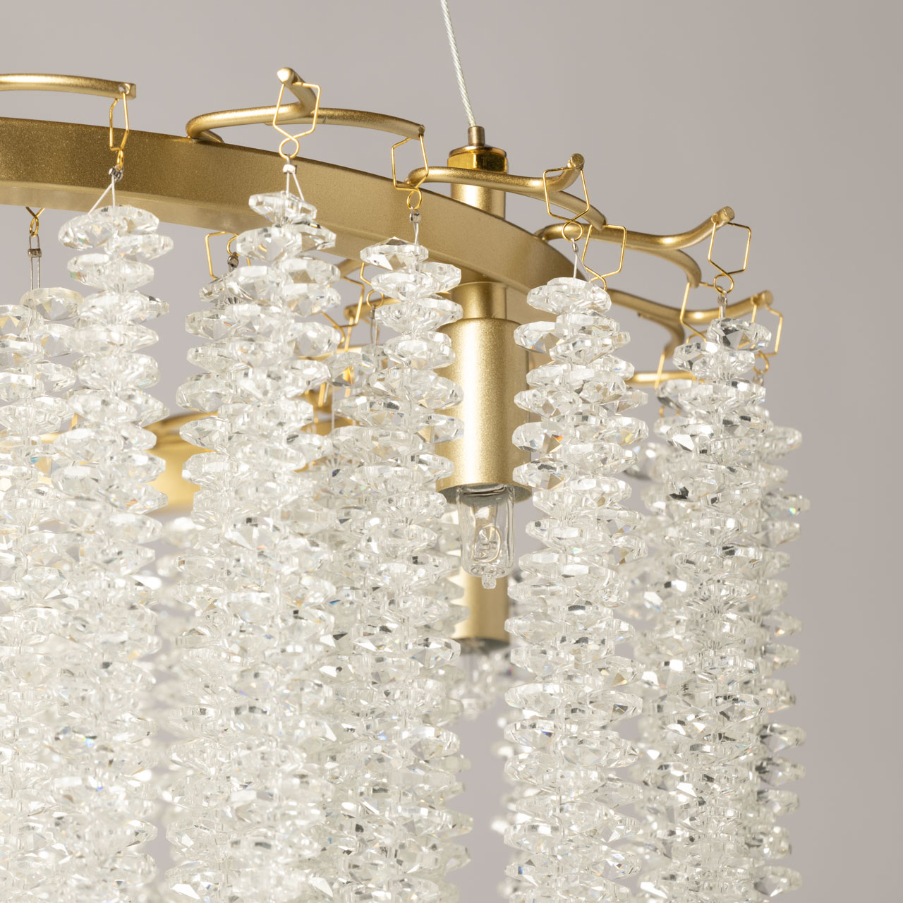Металлическое основание подвесной люстры гальванизировано в цвет золота. Люстра декорирована прозрачным хрусталем.