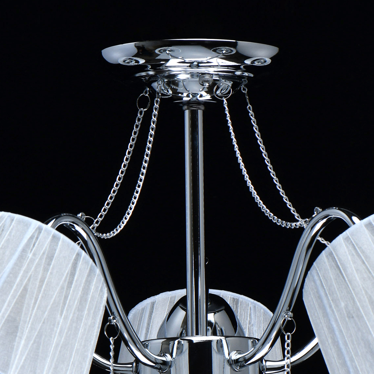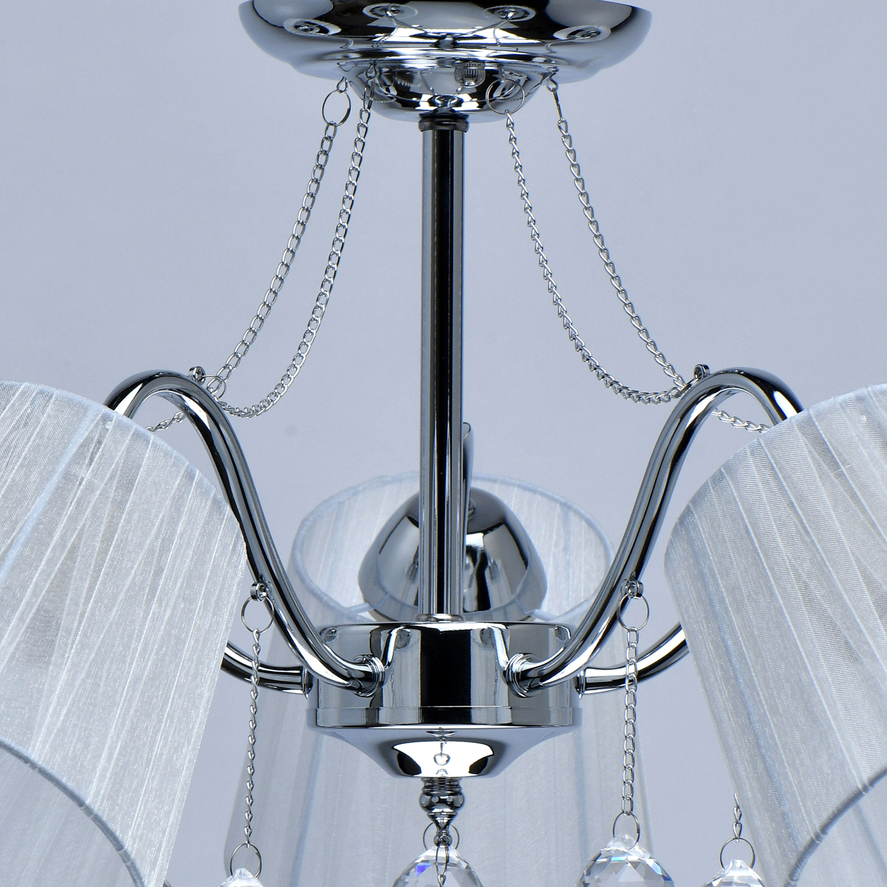 Основание светильника выполнено из сплава металла и гальванизировано в цвет хрома. Абажуры из прозрачной органзы белого цвета с термостойким акрилом внутри. Абажуры отделаны кантом сверху и снизу, прошиты. Светильник декорирован металлическими цепочками в цвет основания и прозрачным хрусталем в форме шара.
