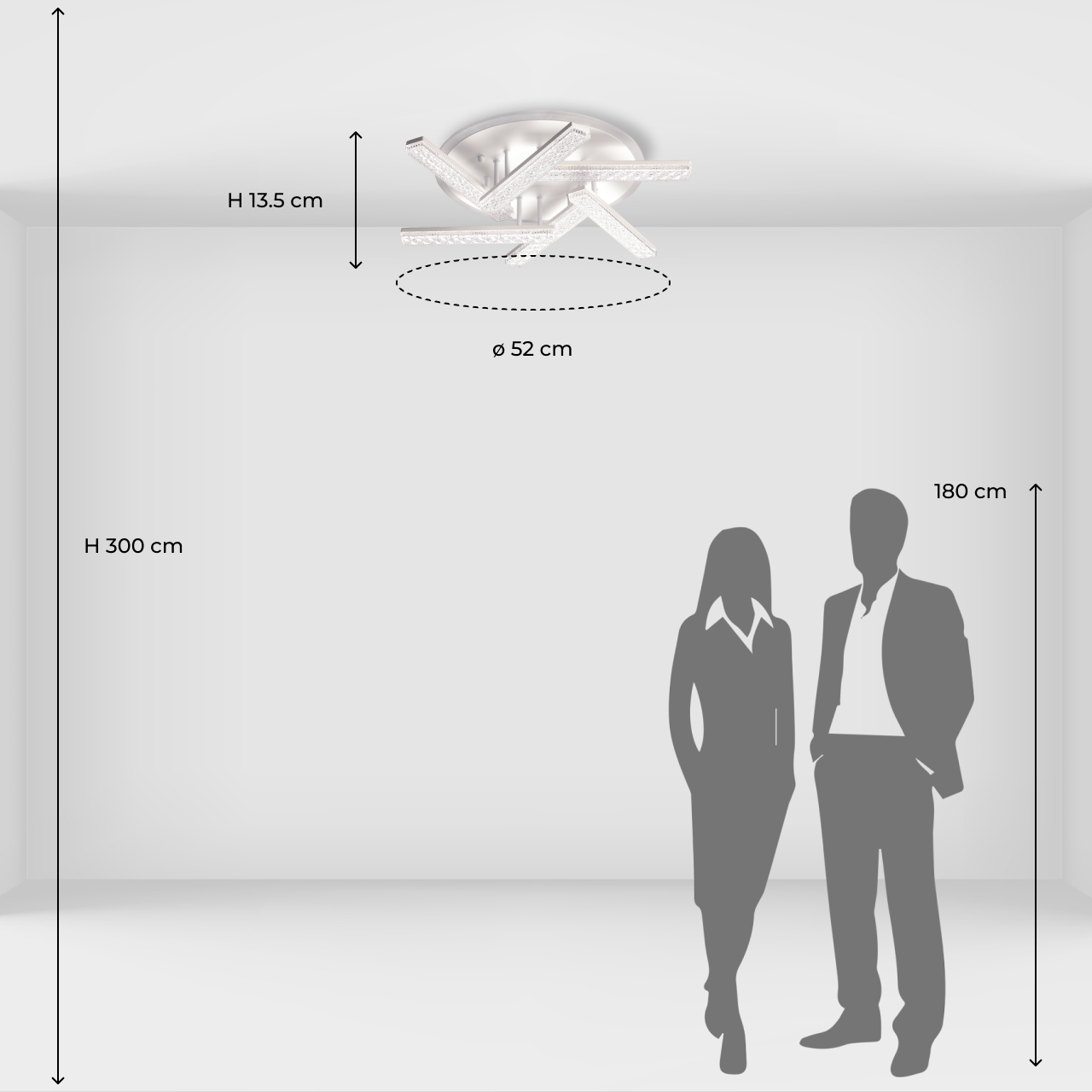 Металлическое основание потолочной люстры окрашено в белый цвет. Светодиодные источники света у потолочной чаши закрыты белым матовым акрилом, на рожках - прозрачным фактурным акрилом.