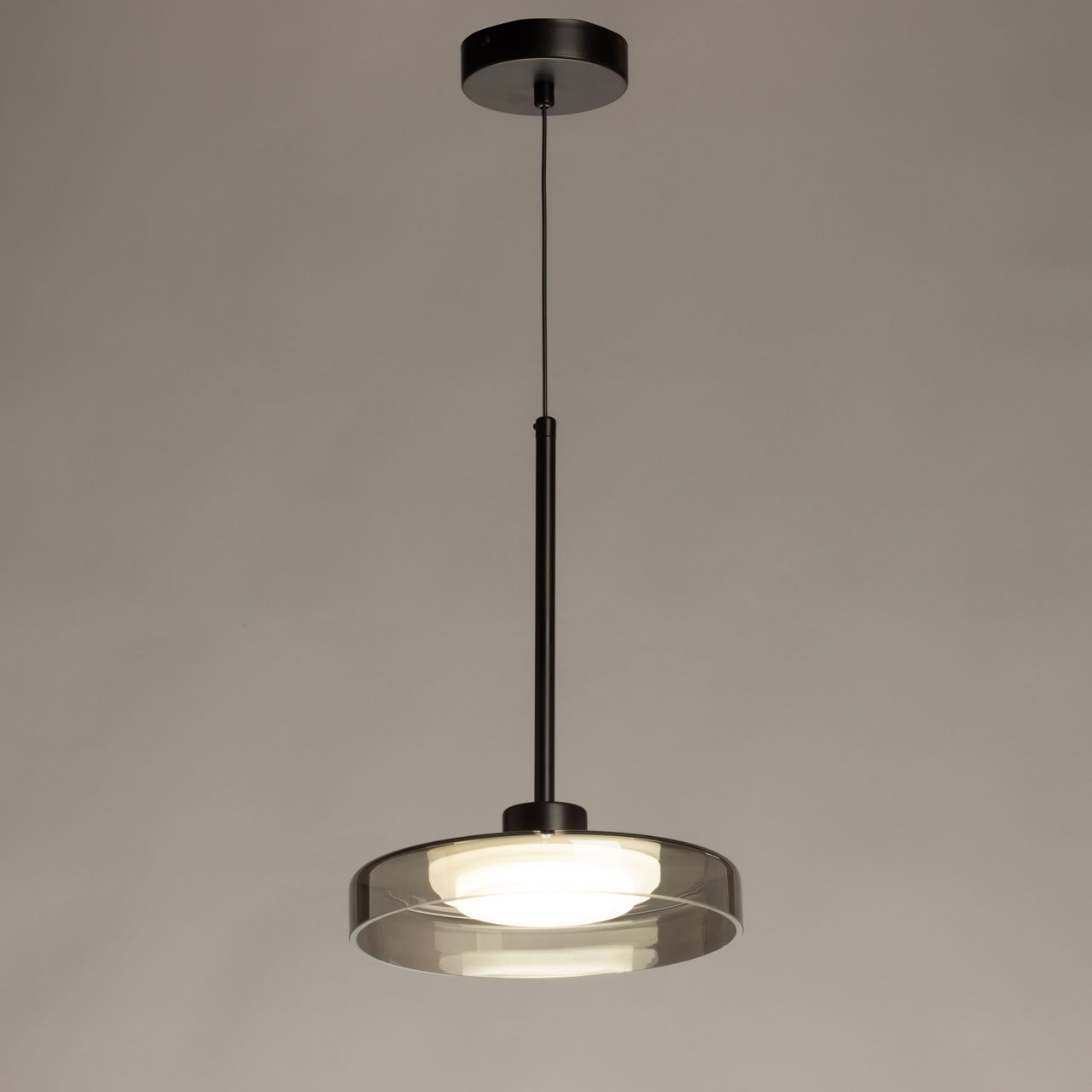 Черный цвет основания создает сдержанный и стильный образ. Стеклянный плафон дымчатого цвета придает люстре элегантности. Светодиодный источник света закрыт матовым акрилом, создавая равномерное и комфортное освещение. Качественные светодиоды экономичны и безопасны. Возможность регулировать комфортную высоту.