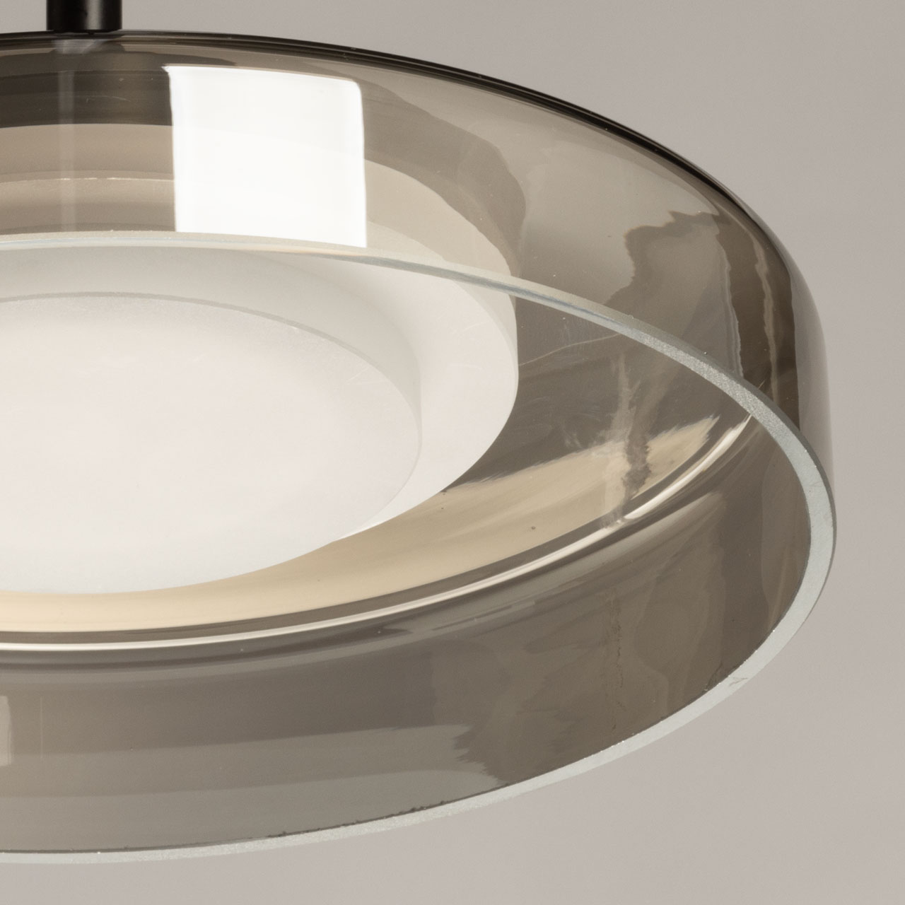 Металлическое основание светильника окрашено в черный цвет. Стеклянный плафон гальванизирован в дымчатый цвет. Светодиодный источник света закрыт белым матовым акрилом.