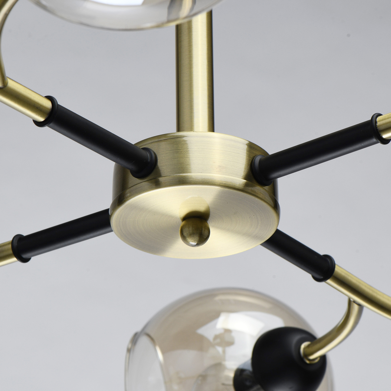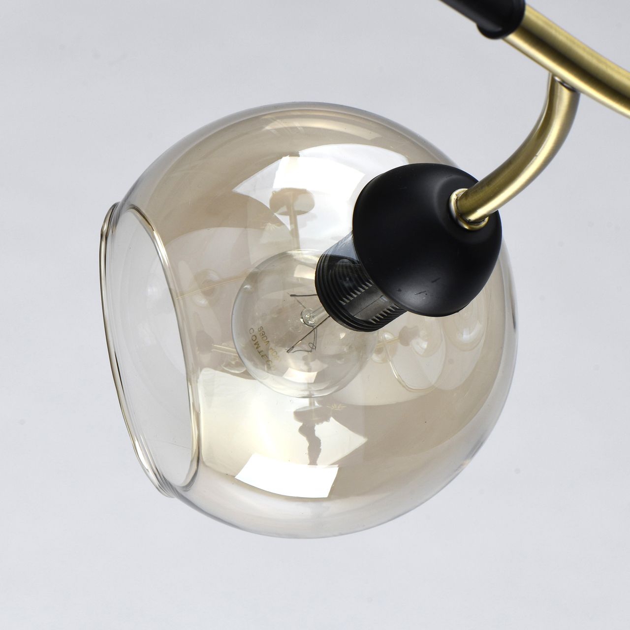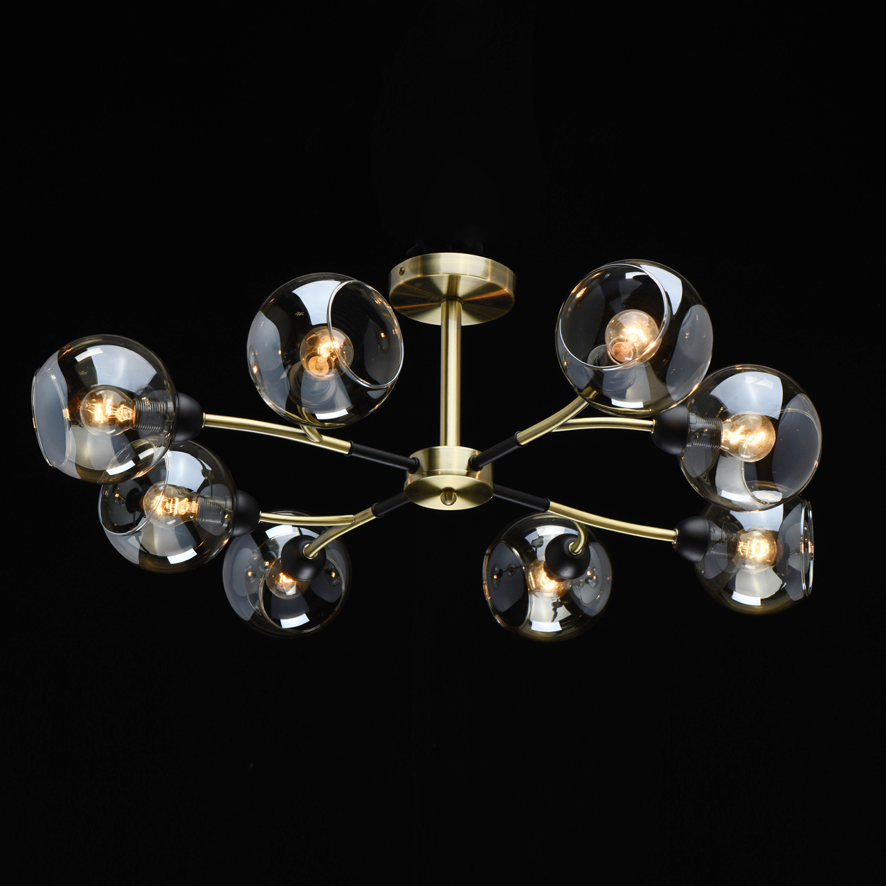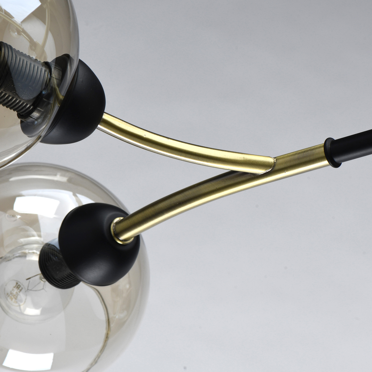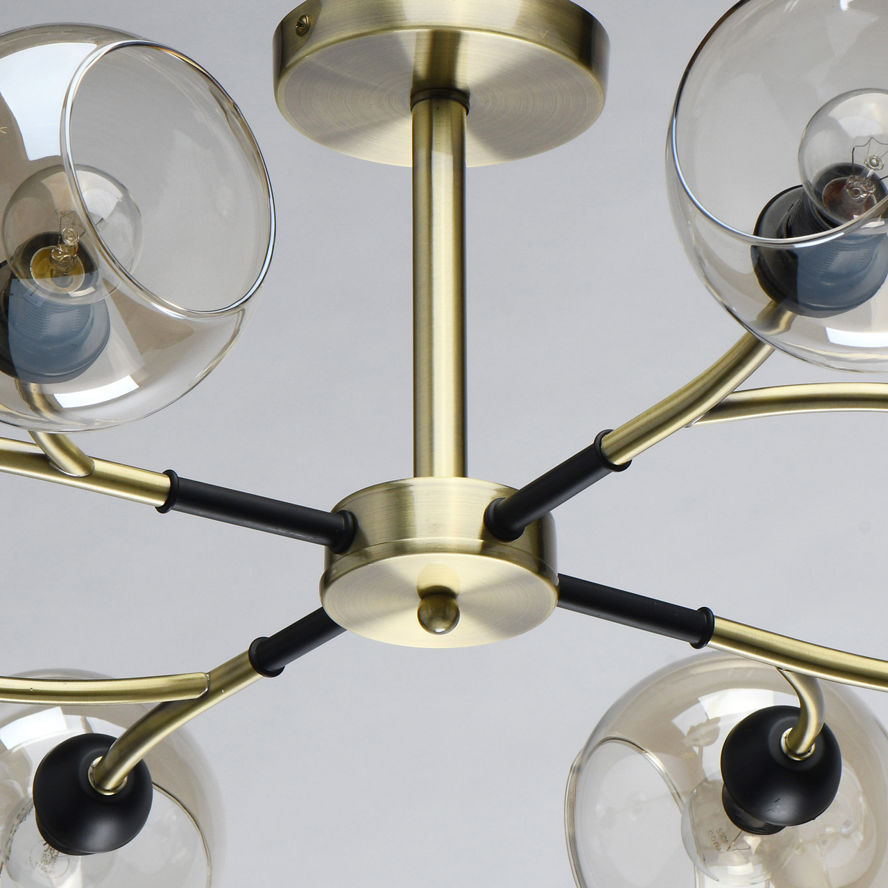 Конструкция дизайнерского светильника состоит из металлического основания, окрашенного в оттенок латуни, и прямых рожков аналогичного цвета, напоминающих разветвленные стебли растения. Отдельные элементы черного цвета придают строгости, делают дизайн более сдержанным. Плафоны из стекла тона шампань имеют сложную форму с эффектом оплавленных краев, причудливо бликуют на свету. Сочетание бронзы с черным выглядит современно и свежо.