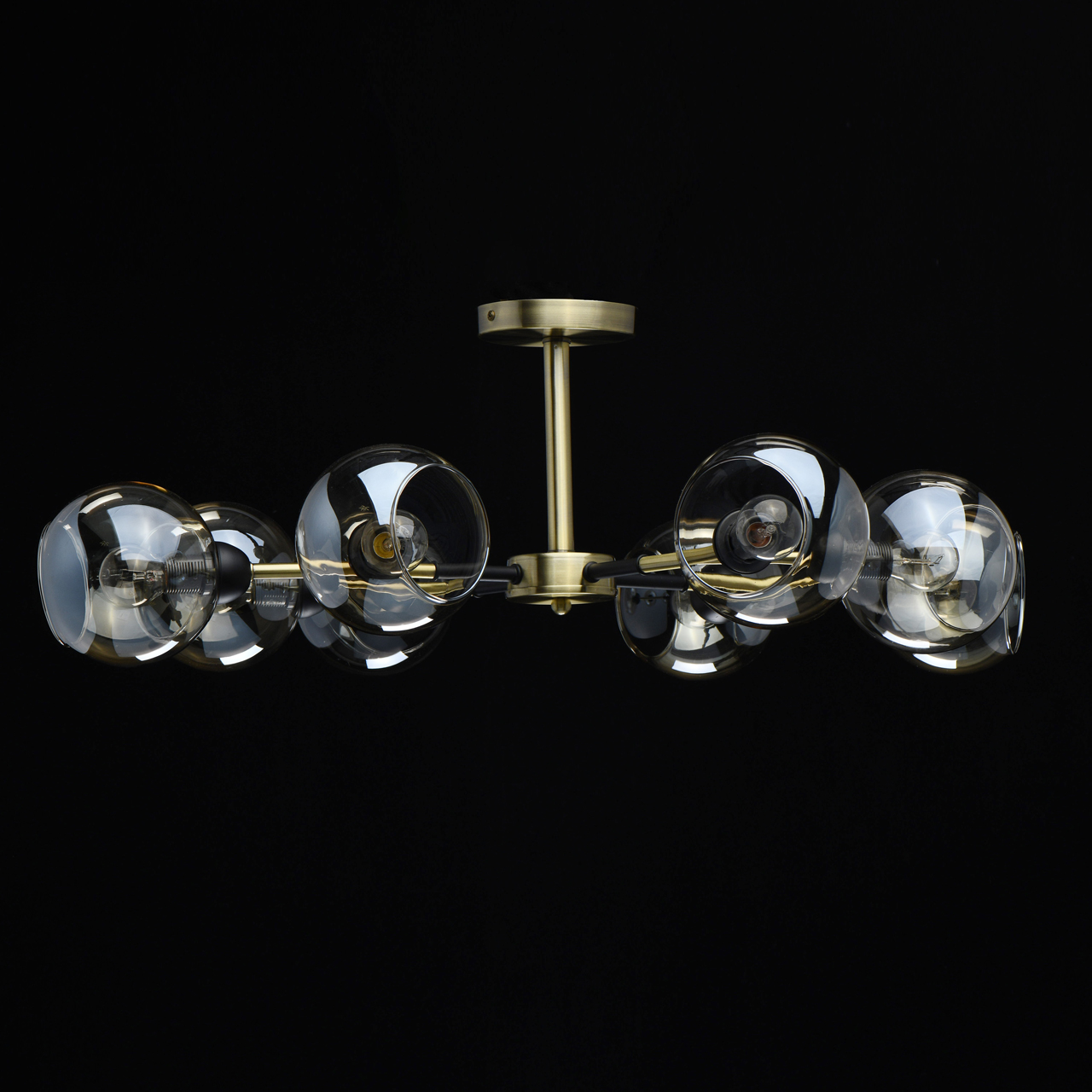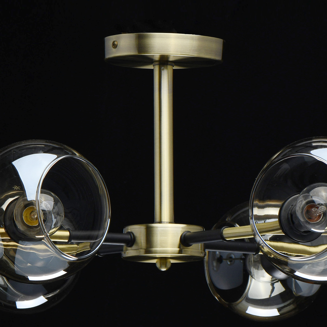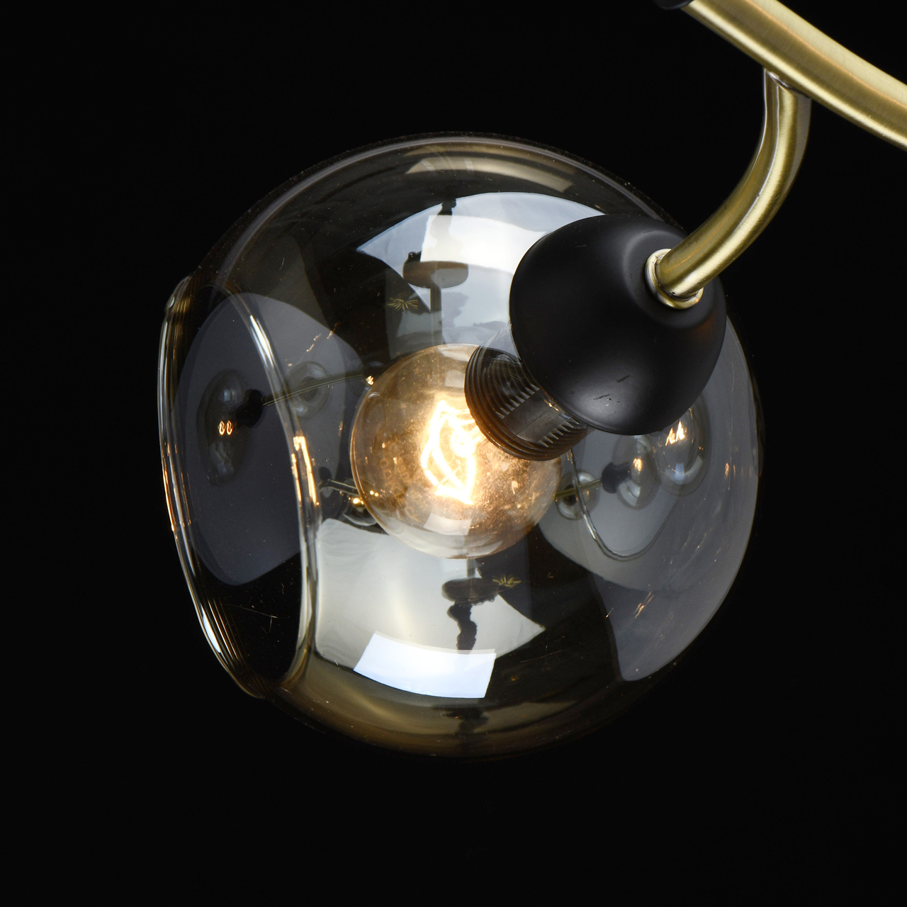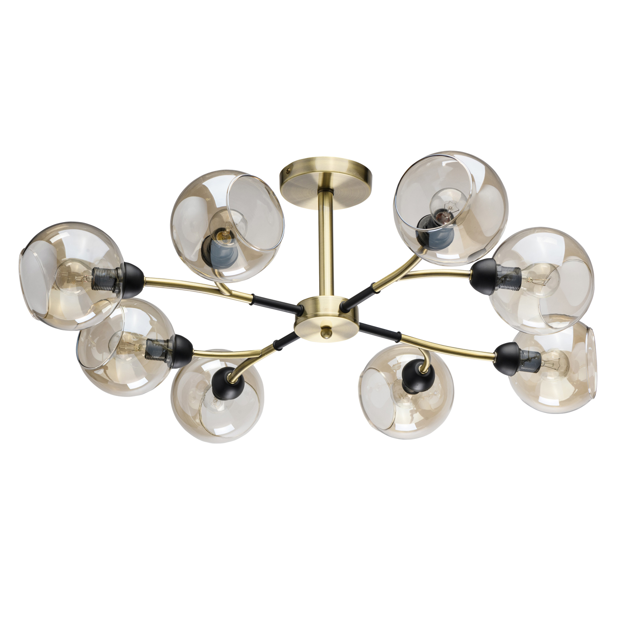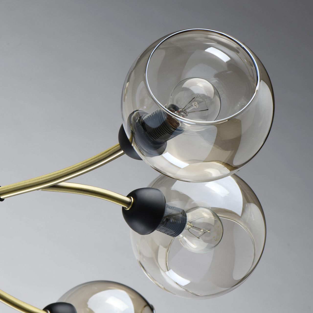 Конструкция дизайнерского светильника состоит из металлического основания, окрашенного в оттенок латуни, и прямых рожков аналогичного цвета, напоминающих разветвленные стебли растения. Отдельные элементы черного цвета придают строгости, делают дизайн более сдержанным. Плафоны из стекла тона шампань имеют сложную форму с эффектом оплавленных краев, причудливо бликуют на свету. Сочетание бронзы с черным выглядит современно и свежо.