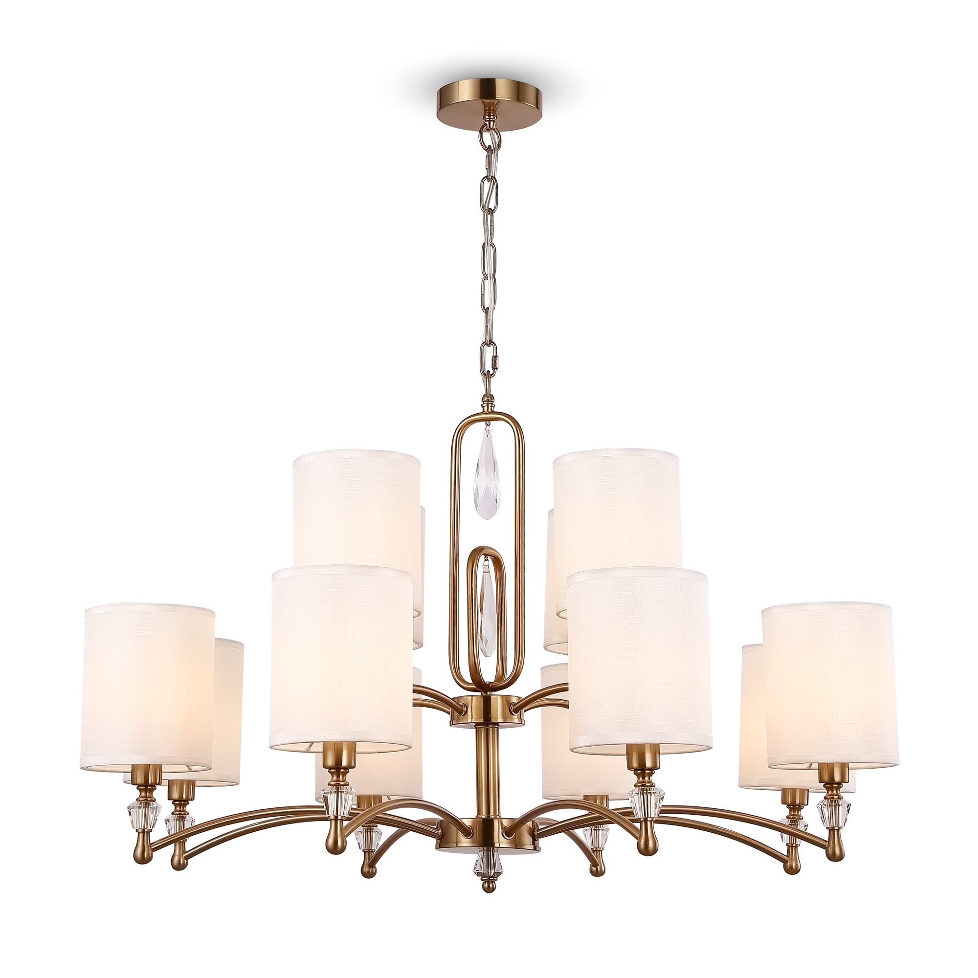 Материал арматуры – нержавеющая сталь, цвет – хром. Материал абажуров – текстиль на ПВХ, цвет – белый. Декор – прозрачное стекло. Акцентные стеклянные кристаллы на рожках со сложной огранкой.