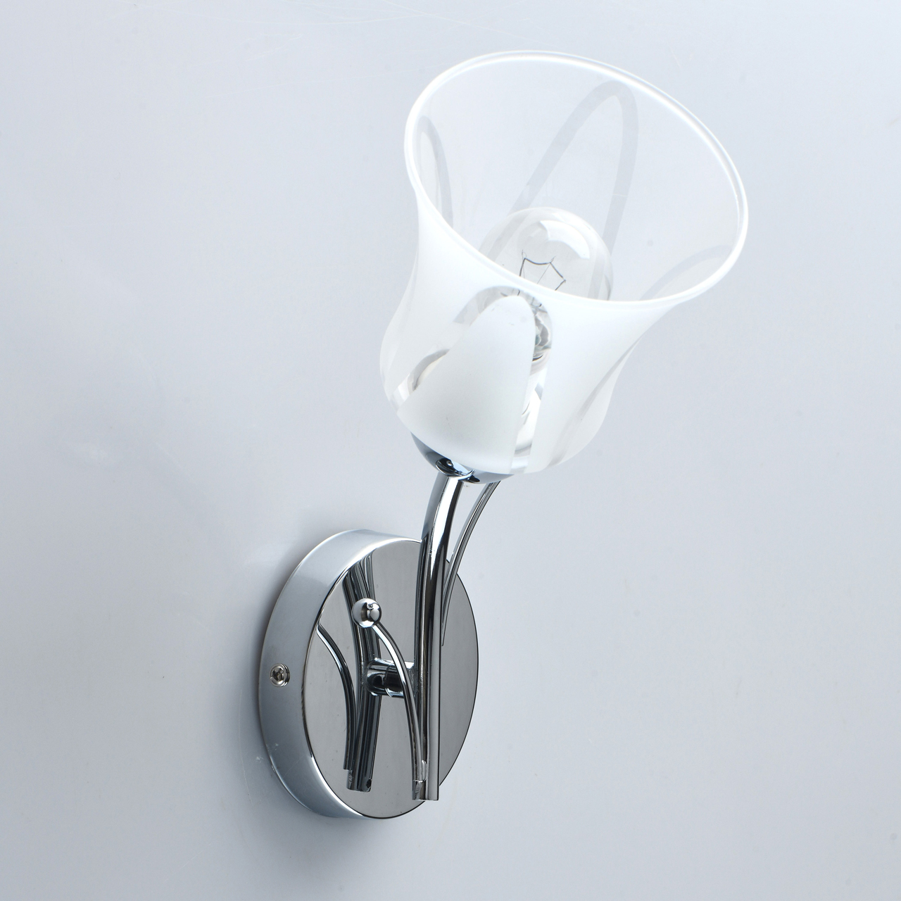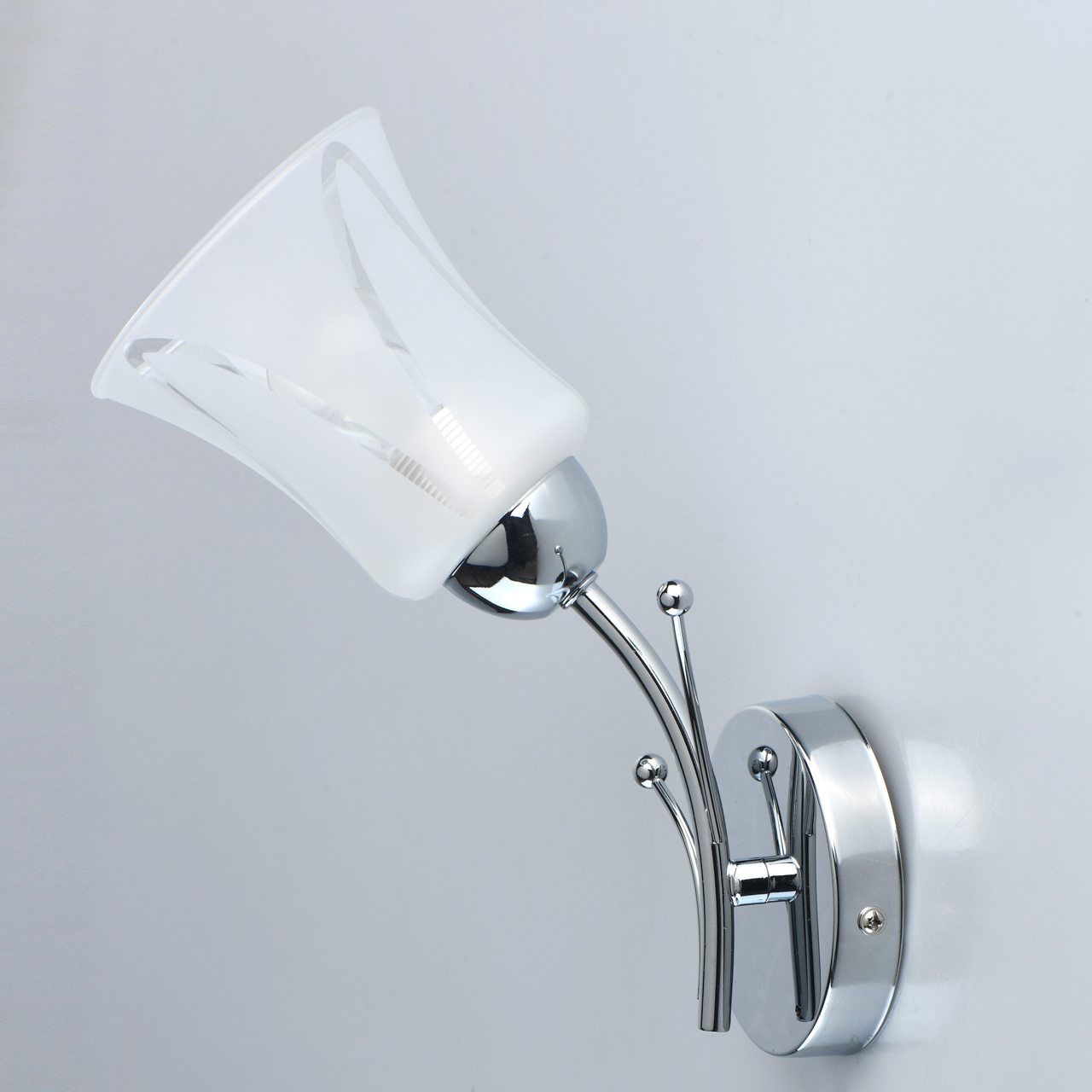 Основание бра выполнено из металла и гальванизировано в цвет хрома. Светильник декорирован стеклянным плафоном, обработанным по технологии пескоструйного матирования по трафарету