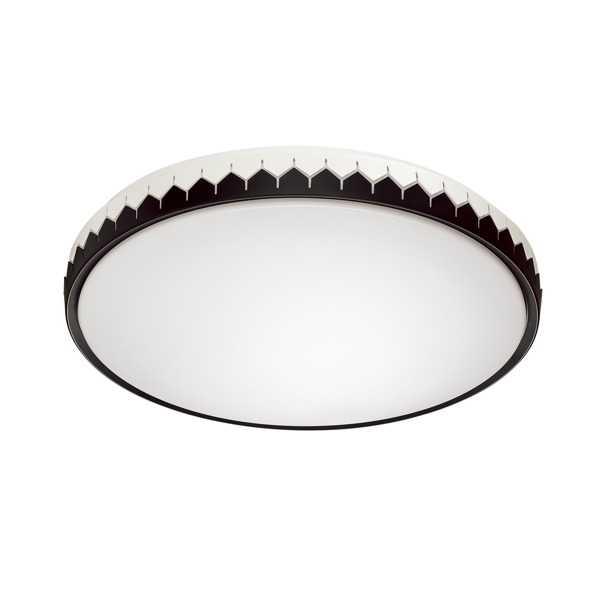 Светильник 3053/EL линии DORTA состоит из металлического основания (базы) и пластикового рассеивателя. Материал рассеивателя - качественный пластик белого цвета с матовой поверхностью, обеспечивающий светильнику равномерное рассеивание и хорошее светопропускание. Форма плафона: круглая, декорирована ободом в виде орнамента из металла черно-белого цвета. Степень защиты IP43 позволяет использовать светильник в определенных зонах влажных помещений. В комплект входит заменяемый LED модуль с линзами, мощностью 72Вт, которая соответствует лампе накаливания 520Вт. А также пульт ДУ, с помощью которого осуществляется плавное изменение цветовой температуры 3000-6000К, изменение яркости, переход в режим переключения теплого/белого/холодного/ночного света. Светильник имеет функцию "память".
