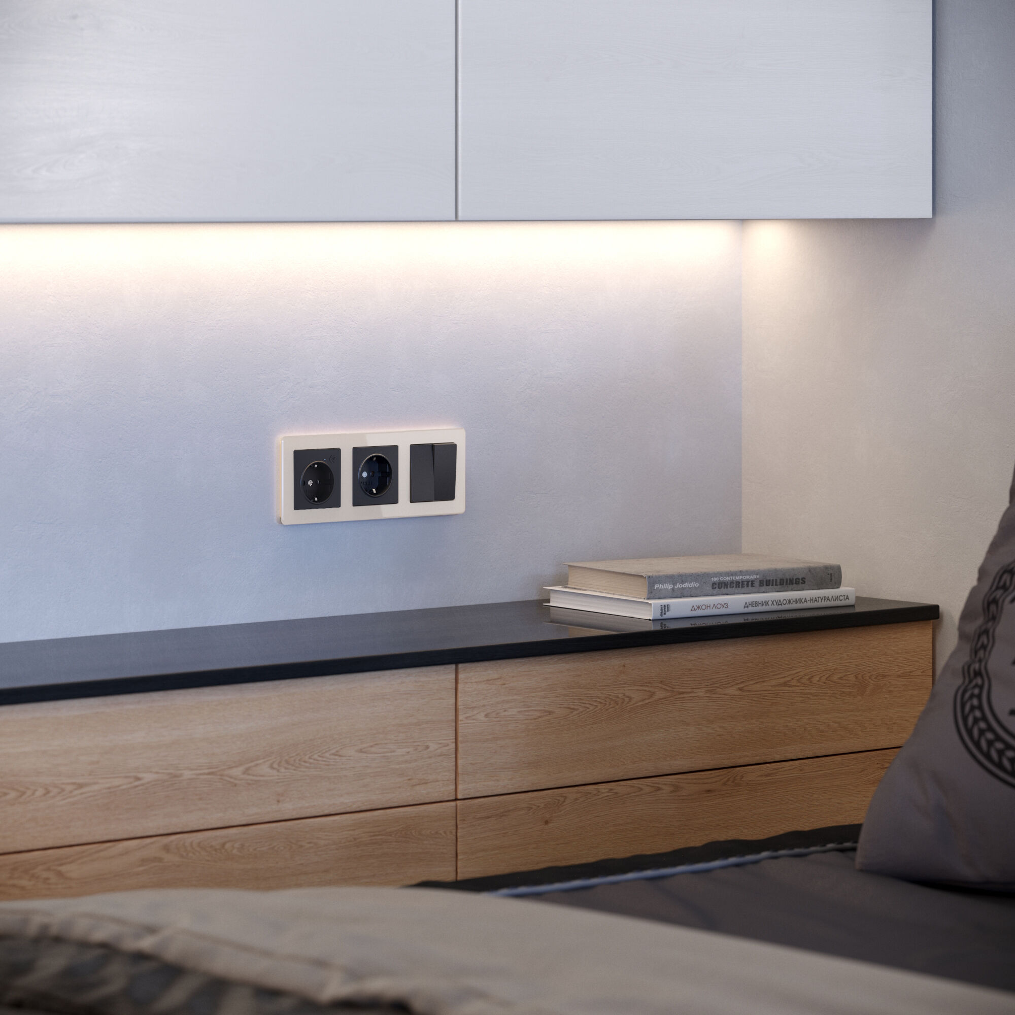 Коллекция представлена в классической цветовой гамме: белый, черный, графит и айвори. Рамки подходят ко всем встраиваемым механизмам Werkel.