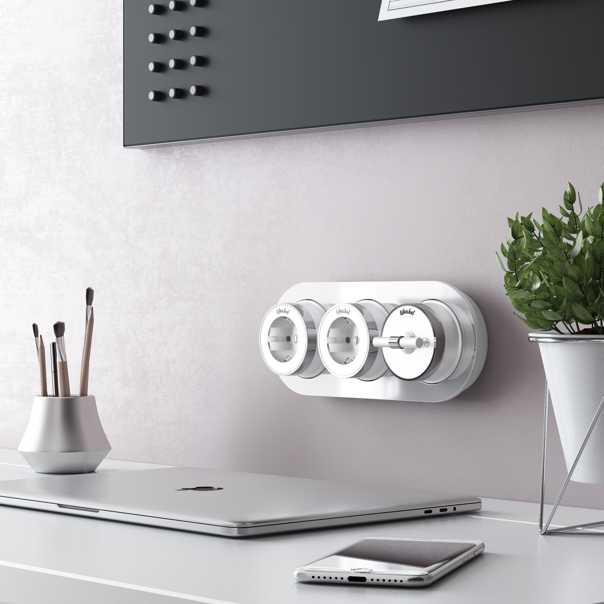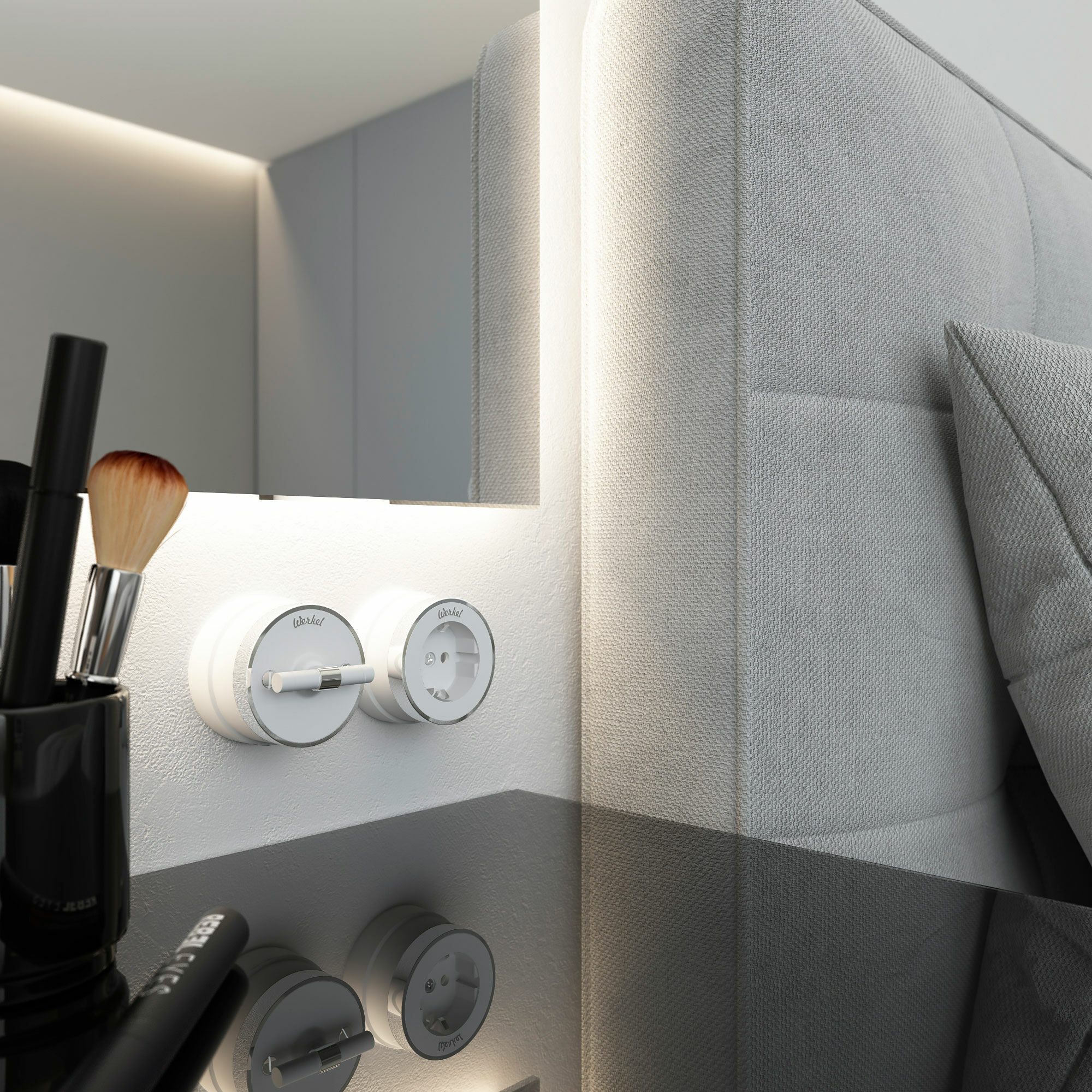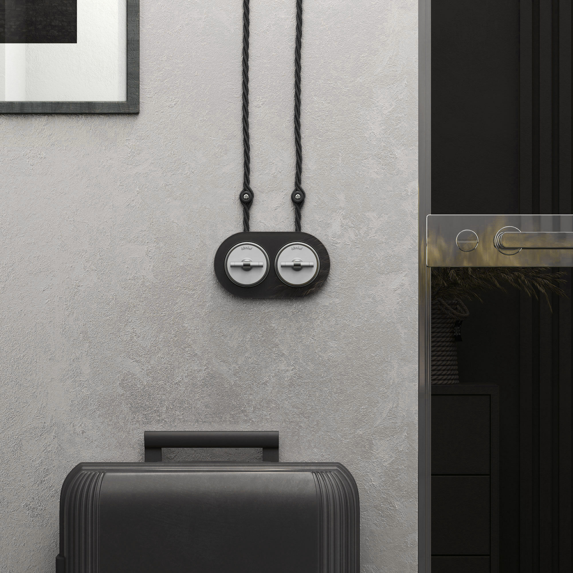Дополнить образ помогут рамки Werkel из металла, стекла, и дерева, а так же аксессуары для накладного монтажа проводки.